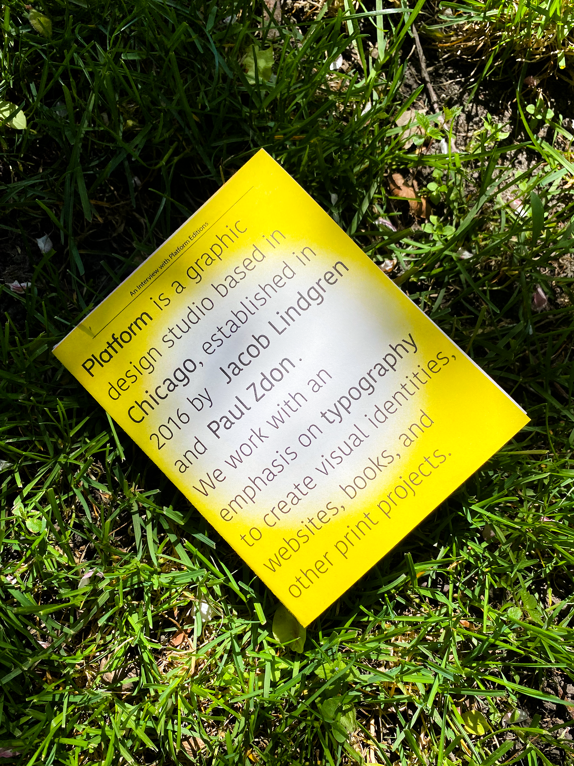 A zine that contains an interview I conducted with Platform Editions. Platform Editions is a graphic design studio based in Chicago, established in 2016 by Jacob Lindgren and Paul Zdon. The interview covers their story of how they started their own studio, their design process, recent projects they worked on, and their life of being a designer.